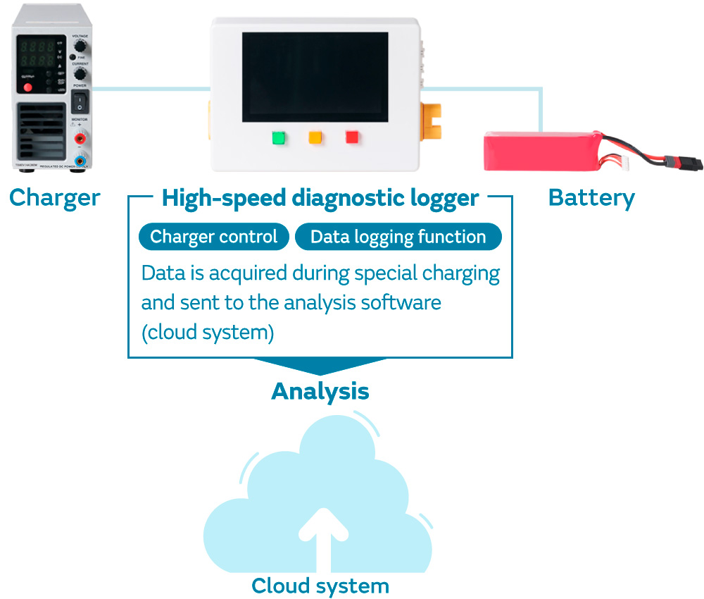 The Lithium-ion secondary battery characterization and degradation diagnosis technology is a solution to be able to non-destructively diagnose the deterioration and resistance increase factors of lithium-ion secondary batteries, and simulate the battery characteristics. This is achieved by connecting a high-speed diagnostic logger between the charger and battery and then charging the battery. It is possible to accurately grasp the current state of lithium ion secondary batteries in a short time by using this technology.